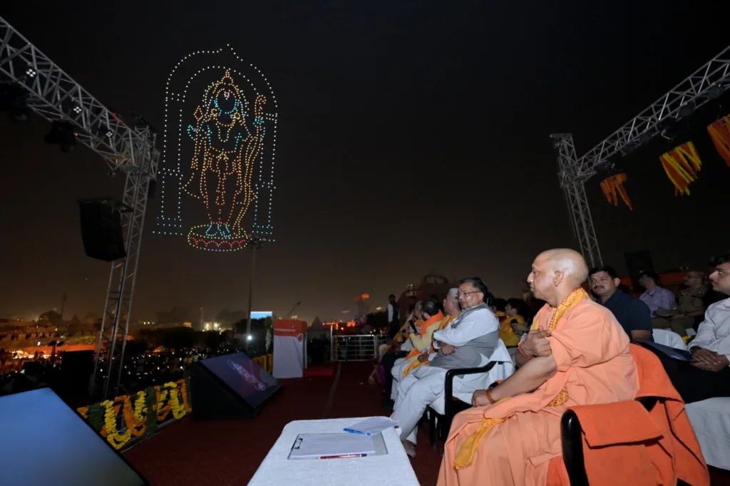 शाम ढलते ही आकाश में 1100 स्वदेशी ड्रोनों का शो चला, जिसमें रामायण के प्रसंग उकेरे गए। राम की आकृति बनाकर आसमान को रोशन किया गया, तो लेजर शो ने सरयू तट को स्वर्ग जैसा बना दिया।